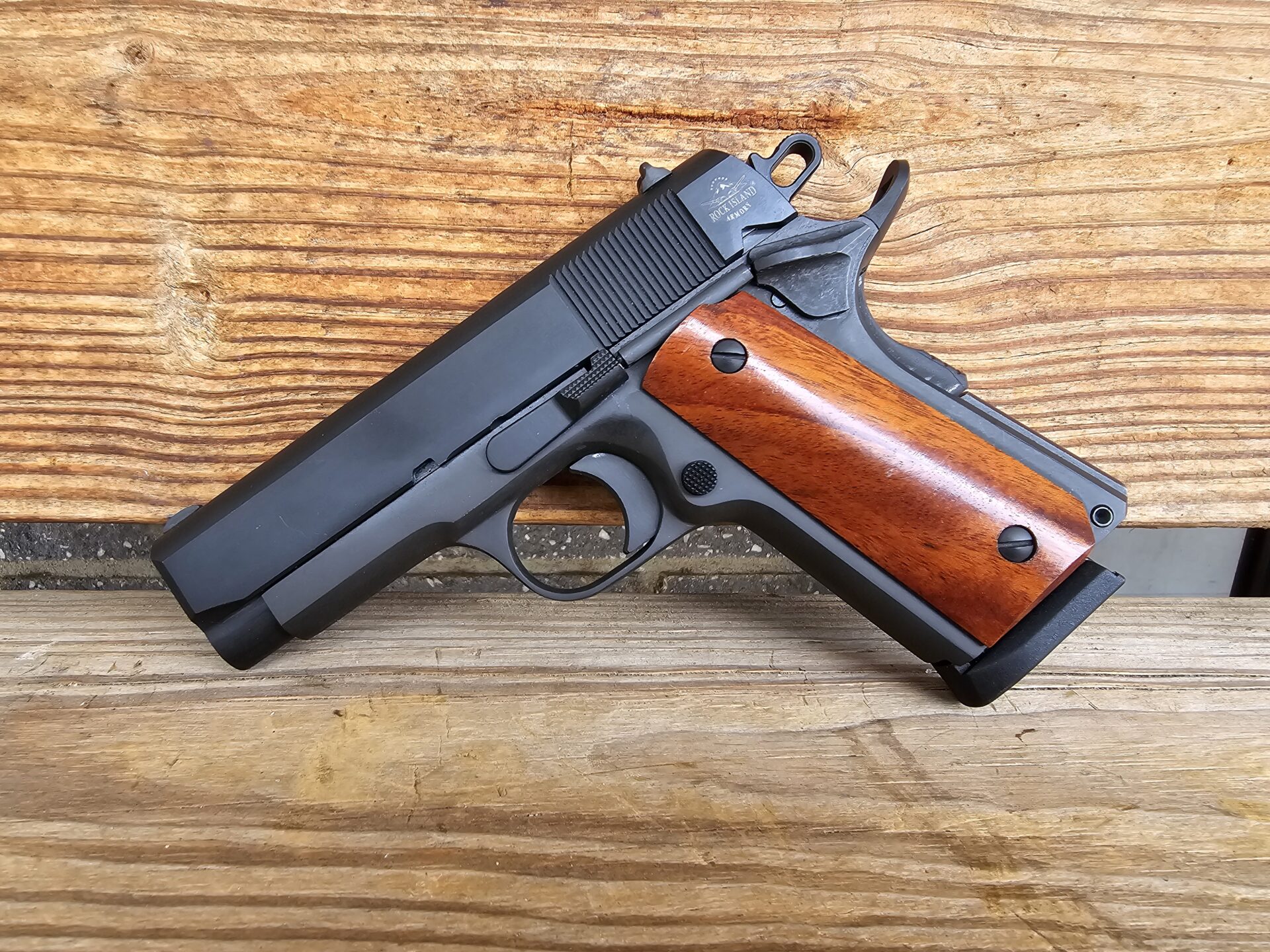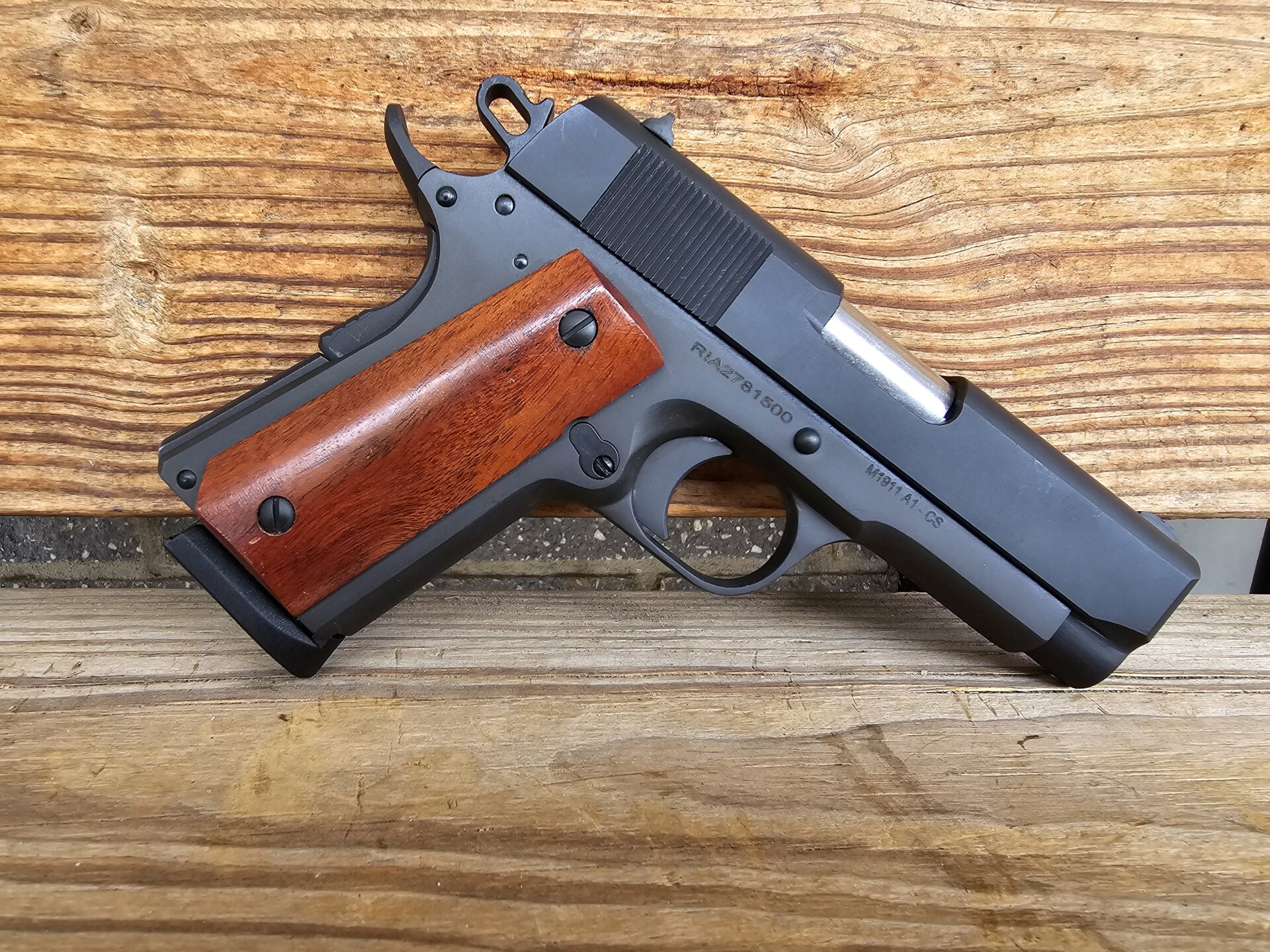 Classic 1911 Design: Fixed low-profile sights, parkerized steel finish, and wood grips stay true to the original U.S. GI sidearm.