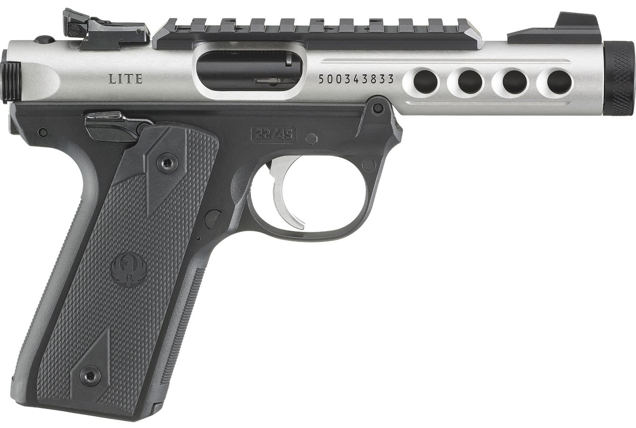 The Ruger MKIV 22/45 Lite is a lightweight, reliable, and versatile .22 caliber pistol designed for training, plinking, and target shooting. The model features a ported, anodized aluminum receiver with a natural finish that provides a sleek contrast to the black grip and barrel. This combination ensures both an appealing aesthetic and functional performance.