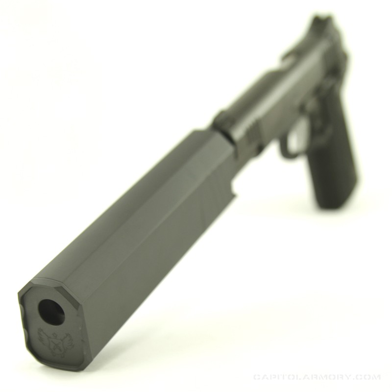 - Monocore Baffle Design: The eccentric, monocore baffle design increases internal volume below the bore line, providing superior sound suppression without obstructing standard pistol sights.
